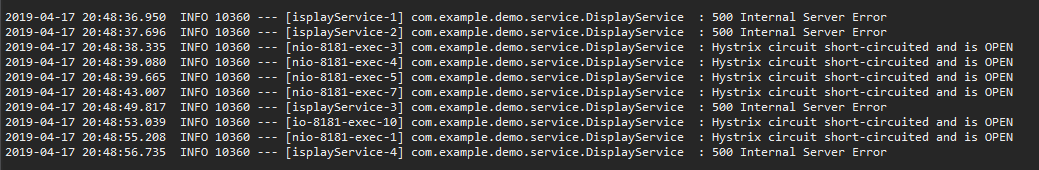 sleepWindowInMilliseconds값이 6000이므로 서킷이 한 번 열리면 6초 동안 다른 서비스를 호출하지 않고 "즉시" fallback method를 실행해버린다. 그래서 발생한 예외를 로깅해보면 서킷이 오픈됐다고 알려준다.