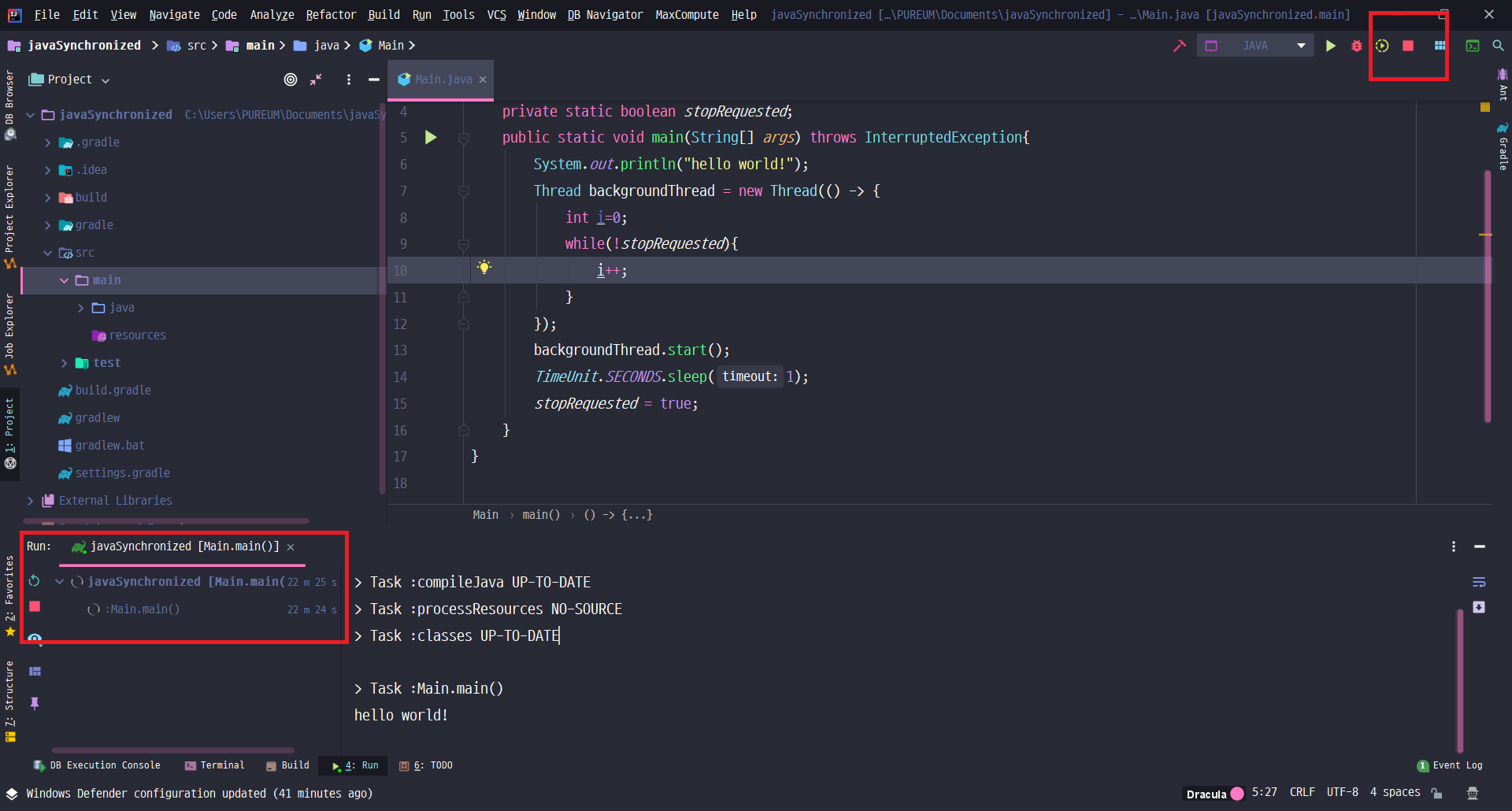 그냥 빈 System.out.println 만 해도 스레드가 종료되는 것으로 보아 메서드 프린트 메서드만해도 뭔가 캐시에 새로운 게 쌓이는 구나하고 말았습니다... (정확한 정보는 알려주실 수 있는 분이 댓글로 남겨주시면 아주 감사하겠습니다.)
