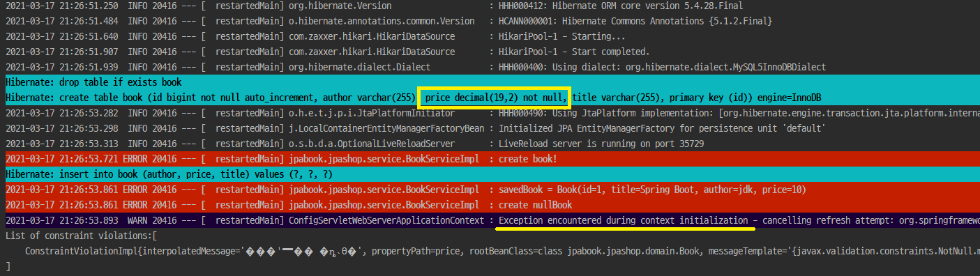 그로인해 두 번째 nullBook을 persist하려할 때 깔끔하게 터져주는 예외를 볼 수 있습니다.